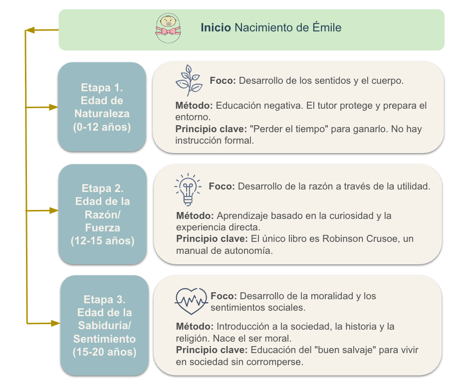 Nota. Este diagrama de flujo ilustra la progresión secuencial y naturalista de la educación propuesta por Rousseau en Émile. Cada etapa se construye sobre la anterior, respetando el desarrollo orgánico del niño y posponiendo la instrucción formal y social hasta que la naturaleza del individuo esté suficientemente fortalecida.