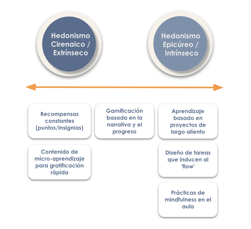 Nota. El diagrama conceptualiza las estrategias pedagógicas de base hedonista a lo largo de un espectro. En un extremo se encuentran las prácticas que se basan en la gratificación inmediata y la motivación extrínseca, alineadas con una interpretación cirenaica. En el otro extremo, se sitúan las prácticas que buscan cultivar un bienestar duradero y una motivación intrínseca a través de la maestría y la tranquilidad, más cercanas al ideal epicúreo. Fuente: Elaboración propia.