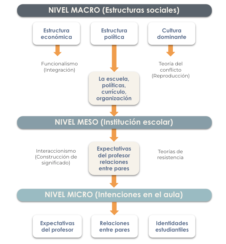 Nota. Este modelo visualiza cómo un análisis sociológico completo debe considerar la influencia descendente de las estructuras sociales (macro), la forma en que se median a través de la institución escolar (meso), y cómo se negocian, aceptan o resisten en las interacciones cotidianas (micro), que a su vez pueden influir en las estructuras más amplias. Fuente: Elaboración propia.