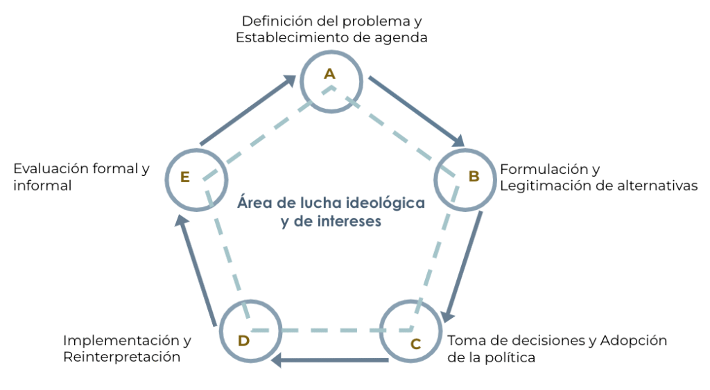 Nota. Este diagrama representa el ciclo de las políticas no como una secuencia técnica y ordenada, sino como un proceso político continuo donde cada fase es un campo de batalla. La evaluación de una política, por ejemplo, influye directamente en la redefinición del problema para el siguiente ciclo. Adaptado de los modelos de Howlett, Ramesh y Perl (2009).