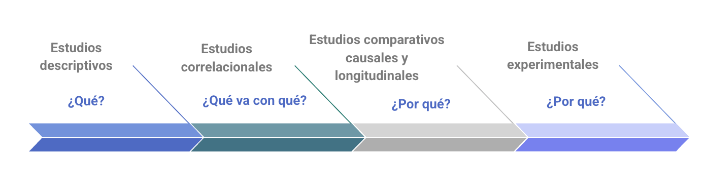 Nota. El esquema visualiza los diseños de investigación como una progresión de rigor causal. El continuo avanza desde los estudios Descriptivos (qué) y Correlacionales (qué va con qué) hacia los Comparativos y Experimentales, que poseen una mayor capacidad para establecer el porqué.