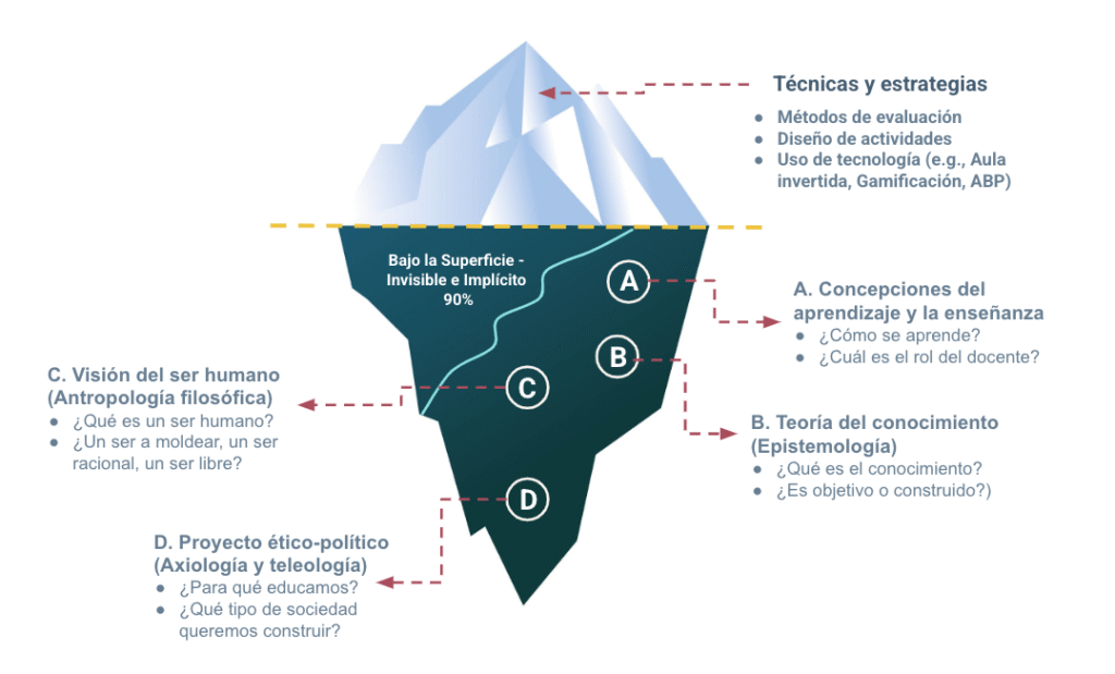 El verdadero «problema de las pedagogías» no reside en la existencia de estos polos opuestos, sino en la ceguera con la que a menudo se adoptan las prácticas de uno u otro. Esto se debe a lo que podemos llamar el «modelo del iceberg pedagógico». Lo que vemos y lo que las políticas educativas suelen importar son las prácticas, las técnicas, la punta visible del iceberg. Lo que no se ve, la inmensa masa sumergida que le da sentido a esas prácticas, son sus fundamentos filosóficos.