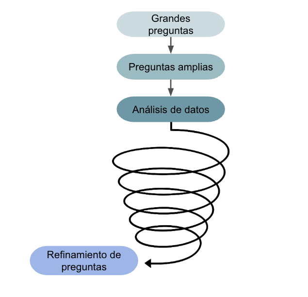 Nota. El diagrama ilustra el carácter iterativo de la investigación cualitativa. Cada ciclo en la espiral representa una fase de recolección de datos, análisis y refinamiento de las preguntas, moviéndose desde observaciones particulares hacia la construcción de patrones y teorías más abstractas. Adaptado de Creswell y Poth (2018).