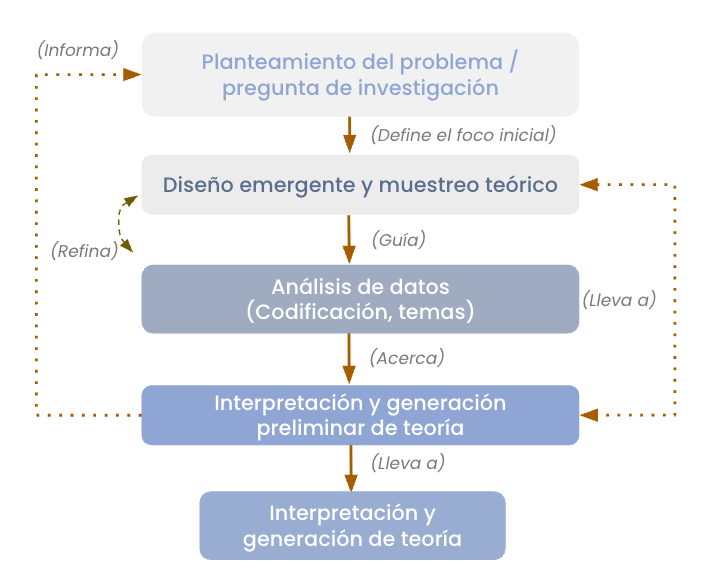 Nota. El diagrama ilustra la naturaleza cíclica y recursiva de la investigación cualitativa. A diferencia de un modelo lineal, el análisis de datos comienza casi simultáneamente con la recolección, y los hallazgos emergentes informan y refinan continuamente las decisiones sobre el muestreo y las fases posteriores de la recolección de datos, en un proceso de constante diálogo entre la teoría y la evidencia empírica.